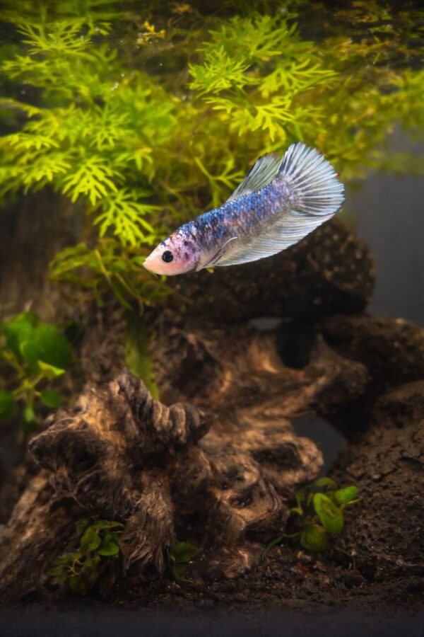 El tronco natural proporciona refugio, reduce el estrés y permite comportamientos naturales del betta.
