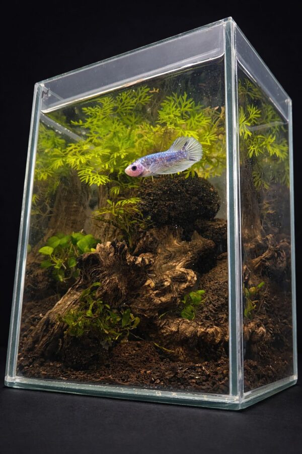 Kit de alojamiento diseñado específicamente para Betta Plakat Marble, priorizando el bienestar del ejemplar, funcionalidad y estética natural. Ideal para decorar espacios del hogar o realizar un presente original y vivo.